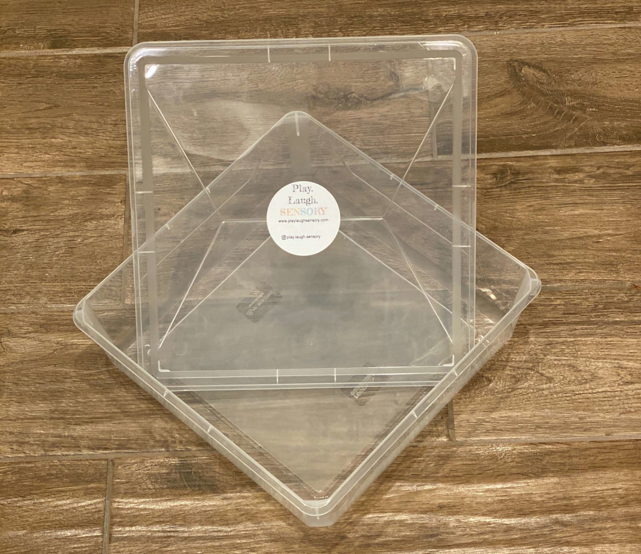 Bin measures approximately 11.8×11.8×3.6″ and comes with a lid that clips into place. It’s great for storing sensory materials between play sessions too!